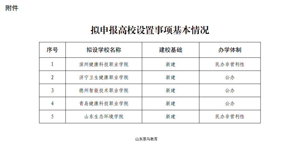 根据《中华人民共和国高等教育法》《中华人民共和国职业教育法》《中华人民共和国民办教育促进法》《普通本科高校设置暂行规定》《山东省高等职业学校设置暂行办法》等法律法规和有关政策规定,现对拟申报的5个高校设置事项予以公示。
